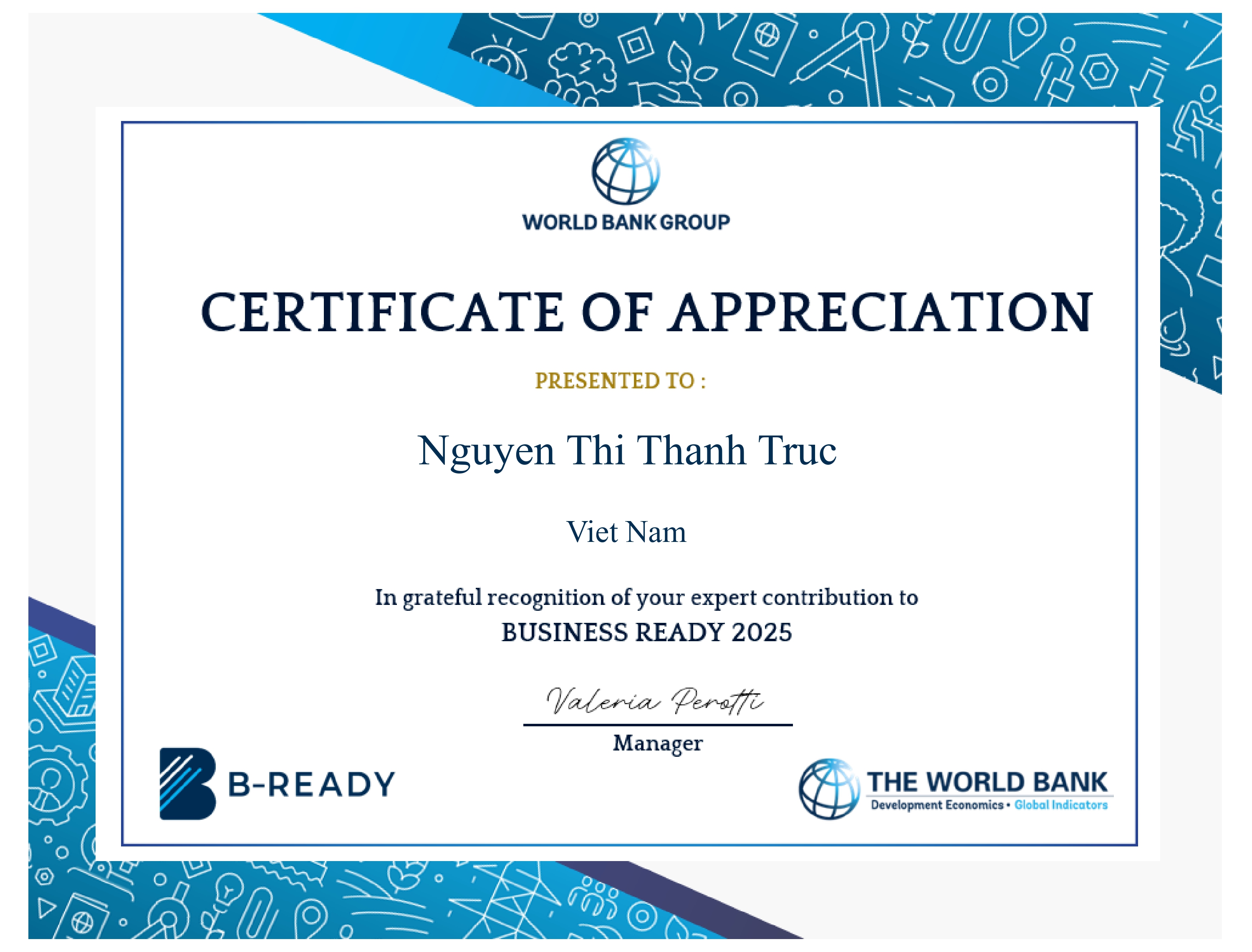 Alongside her dedicated team, Ms. Nguyen Thi Thanh Truc – Associate | Head of Investment & Corporate Services and Ms. Than Thi To Nhi – Legal Assistant, Ms. Lan provided in-depth legal insight into Vietnam’s corporate legal and investment landscape. In acknowledgment of this contribution, they received Certificates of Appreciation by the World Bank.